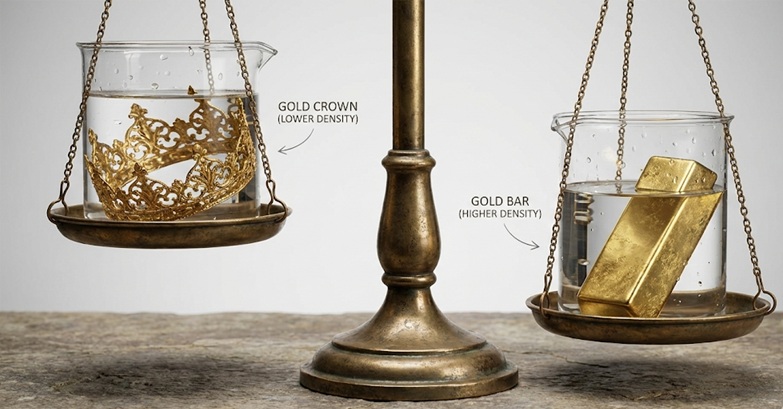 もし王冠が純金なら、水の中でも天秤は釣り合い続けます。しかし、もし銀が混ざっていれば、王冠の方が体積が大きくなるため、水から受ける「浮力」も大きくなり、天秤は純金の方へ大きく傾きます。