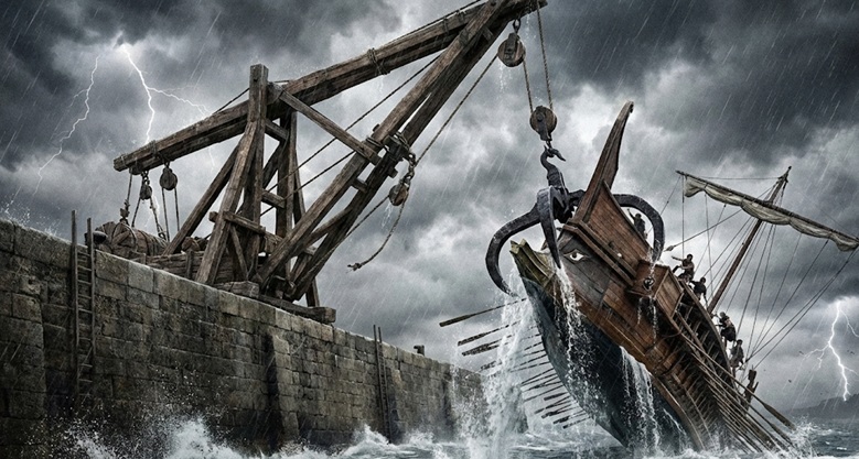 鏡の伝説よりもはるかに現実味があり、恐れられたのが「アルキメデスの鉤爪」です。これは城壁から巨大なクレーンのようなアームを突き出し、敵船の船首を釣り上げて転覆させる兵器です。