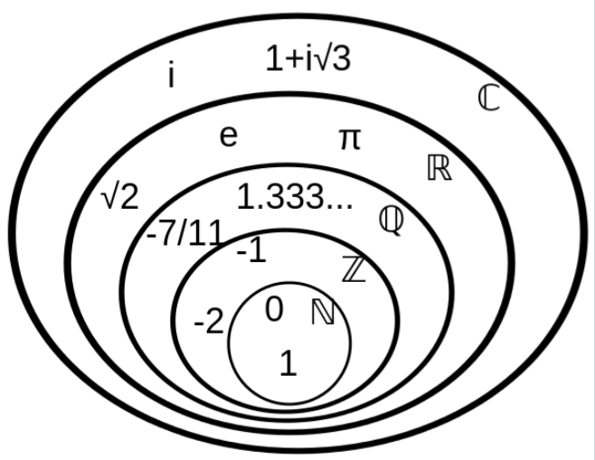 重要なポイントは、これらの数の集合が \mathbb{N} \subset \mathbb{Z} \subset \mathbb{Q} \subset \mathbb{R} \subset \mathbb{C} という「包含関係」にあることです。