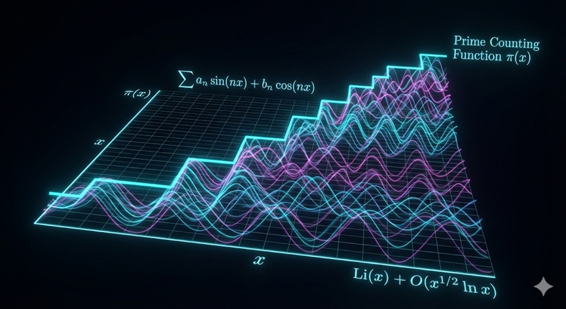 素数の個数を数えるグラフは、素数にぶつかるたびに階段を一歩上るカクカクとした形をしています。リーマンは、ゼータ関数の「零点」の一つひとつが、実は特定の周波数を持つ「波」であることを示しました。無限にある零点から生まれる波をすべて足し合わせると、最終的にこの「素数の階段」と完全に一致するのです。